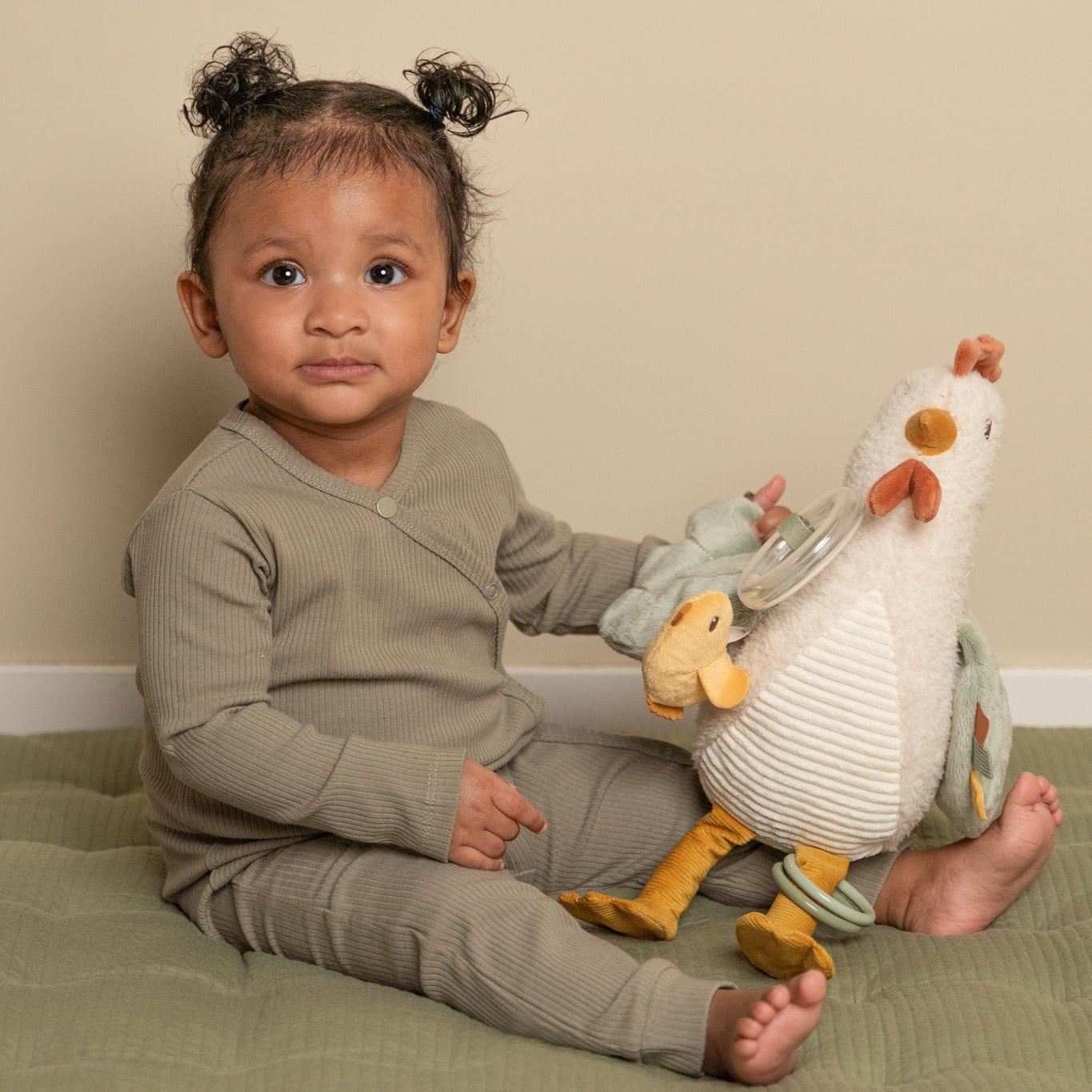 This will be your little one's new best friend. There is so much to see and discover with this soft activity toy in the shape of a chicken! From cute crinkle wings to a rattling sound and labels. This cheerful chicken will definitely stimulate your child's curiosity.