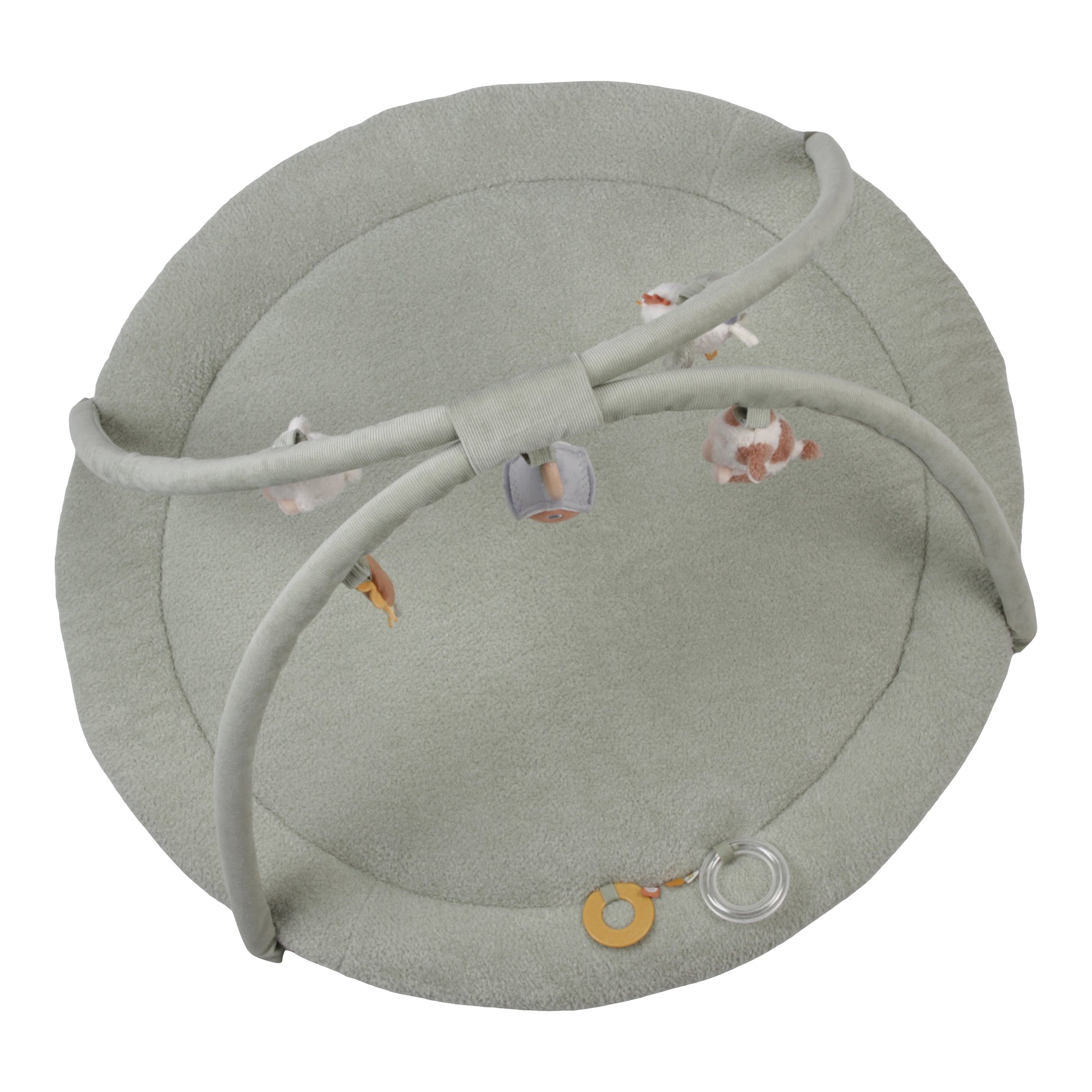 Sensory Adventure Playmat: Embark on daily adventures with the Little Farm collection playmat! This green mat features two large corduroy arches adorned with five different cuddly toys—a chicken, cow, sheep, flower, and barn—designed to captivate your little one's senses and stimulate their hand-eye coordination.