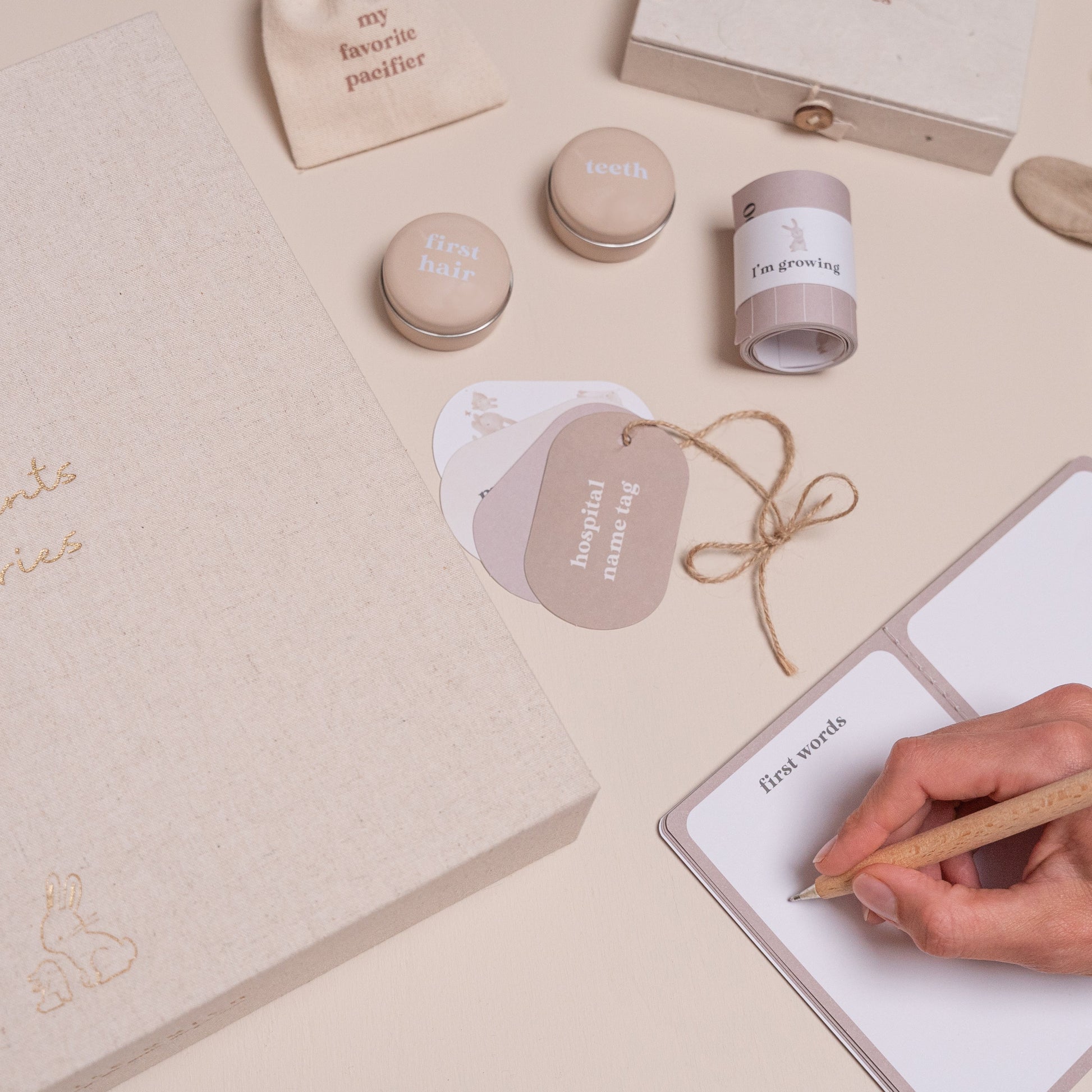 Comprehensive Memory Kit: This memory box is more than just a storage solution; it's a treasure trove of memory-preserving tools. Inside, you'll find a variety of items including a booklet, tags, jute string, kraft envelopes, sticker sheet, photo corners, tin hair box, tin tooth box, Little Treasures storage box, measuring tape, storage bag for the first outfit, and a storage bag for the dummy. Each item is thoughtfully included to help you document and cherish every precious moment of your baby's journey.
