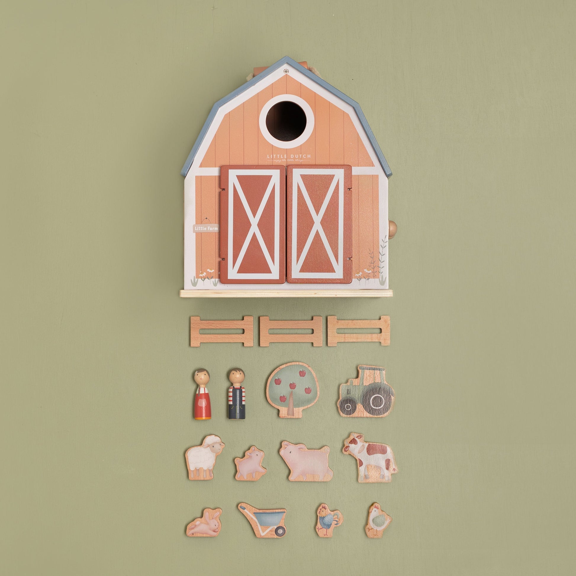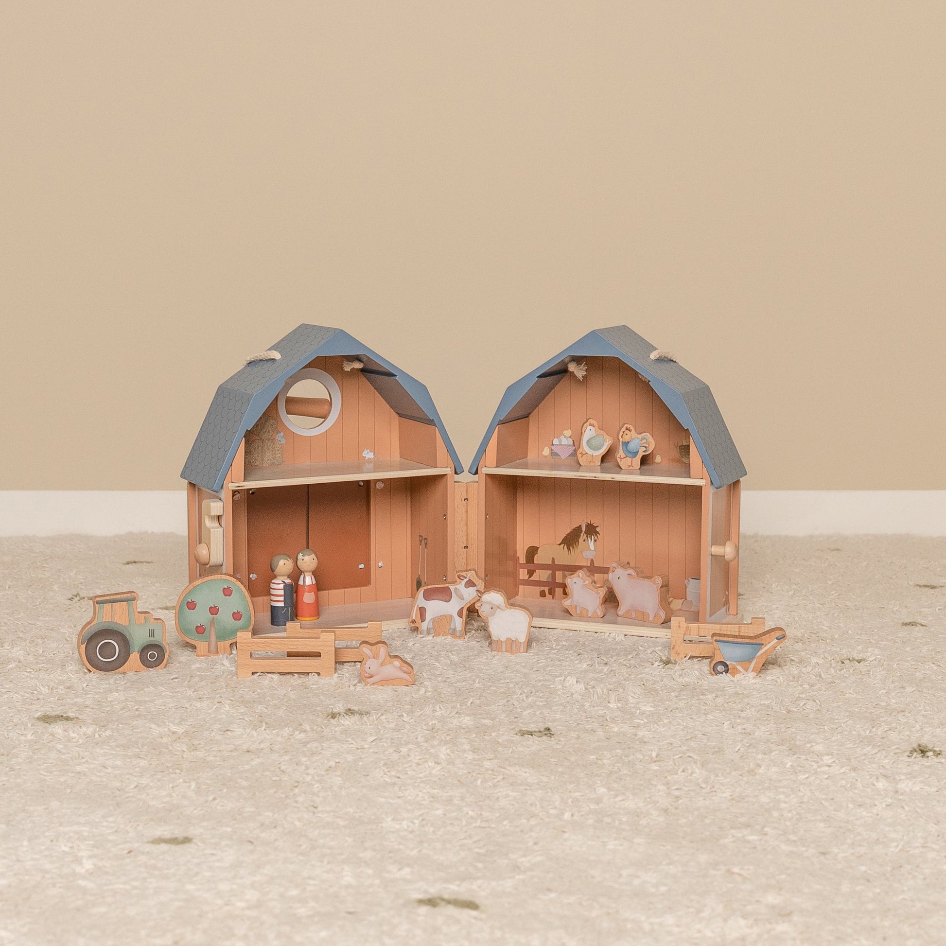 With this playhouse in the shape of a barn that stands on the farm, your little one will have so much fun! Open the barn and the animals will arrive. With all these wooden play figures, your child can create their own story, stimulating their imaginative thinking. And when playtime is over, simply store all the figures inside the playhouse, fold it back up, and tidy it away.