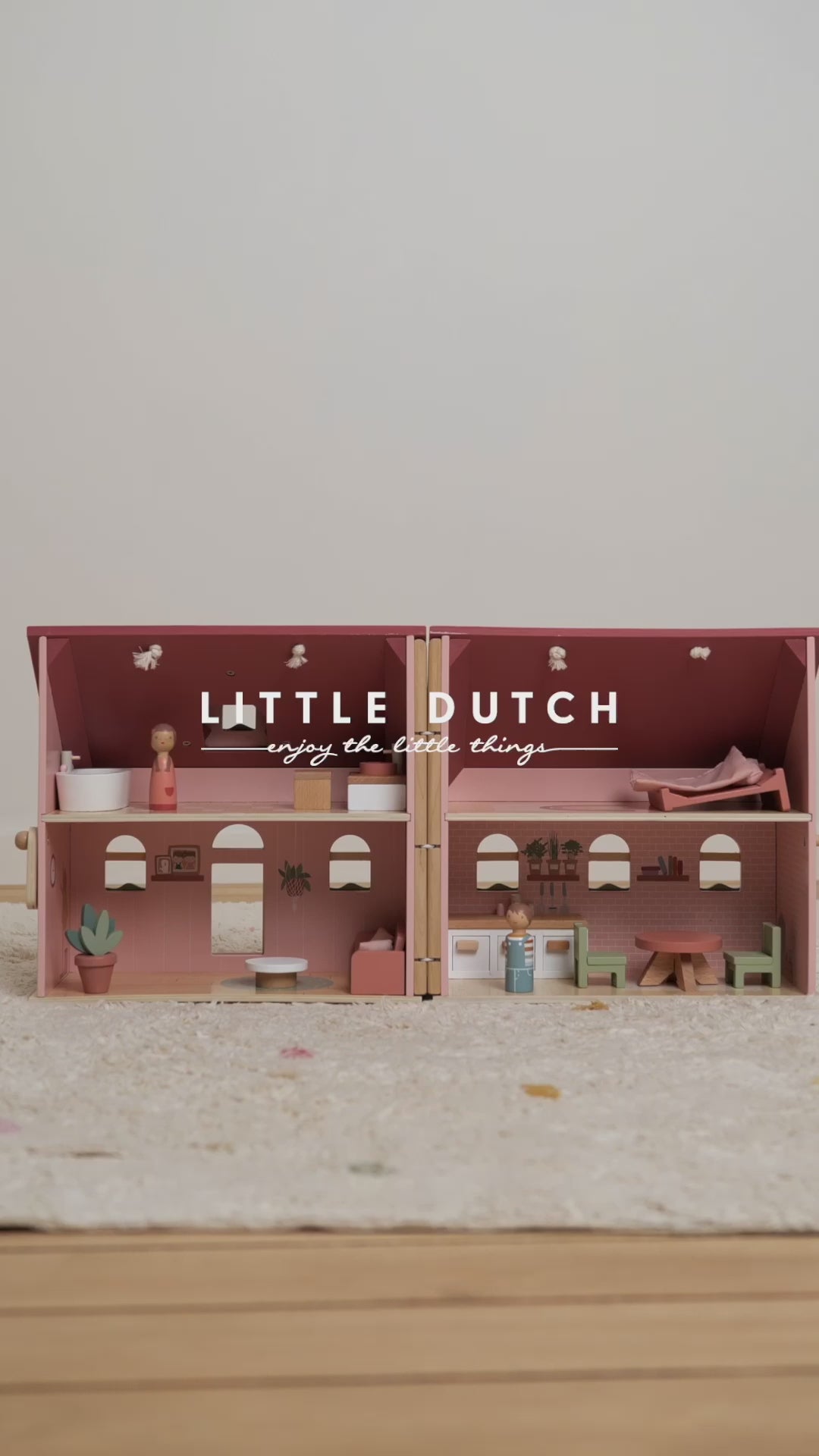 The wooden doll house from Little Dutch is the perfect place for children to unleash their creativity. This beautiful house comes in a white color with a pink roof and features wooden shutters that can be opened and closed.